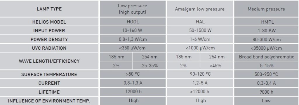 UV Low Pressure Amalgam Lamps don’t contain only mercury: inside the lamp there is a solid amalgam, that is to say an alloy of mercury with other metals. The low-pressure amalgam lamps produced by Helios are the best solution for ultraviolet disinfection and oxidation of water, air and surfaces because they combine a very long working life (up to 20,000 hours) with an excellent UVC efficiency at 254 nm (up to 45%) and a much higher power density than traditional low pressure or mercury medium pressure lamps, as shown in the table below.