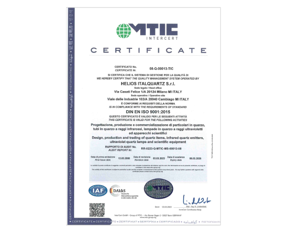 Helios Italquartz S.r.l. since 1940 has specialized in the processing of quartz glass and in the production of IR lamps, UV lamps and scientific equipment. Thanks to a cutting-edge testing laboratory located in the production of Cambiago, Italy, our experts are able to meet every need, studying solutions for the more specific and complex applications.